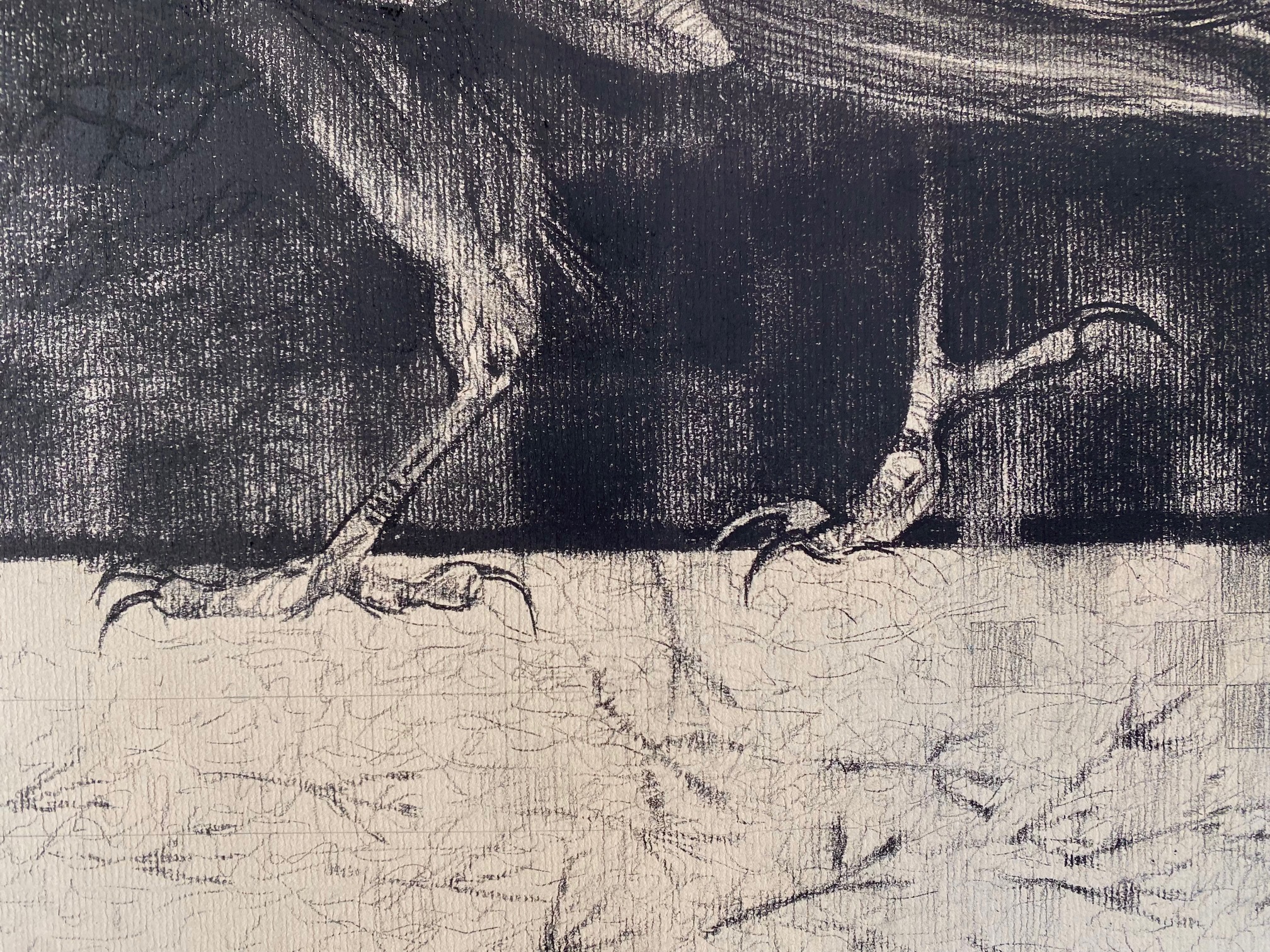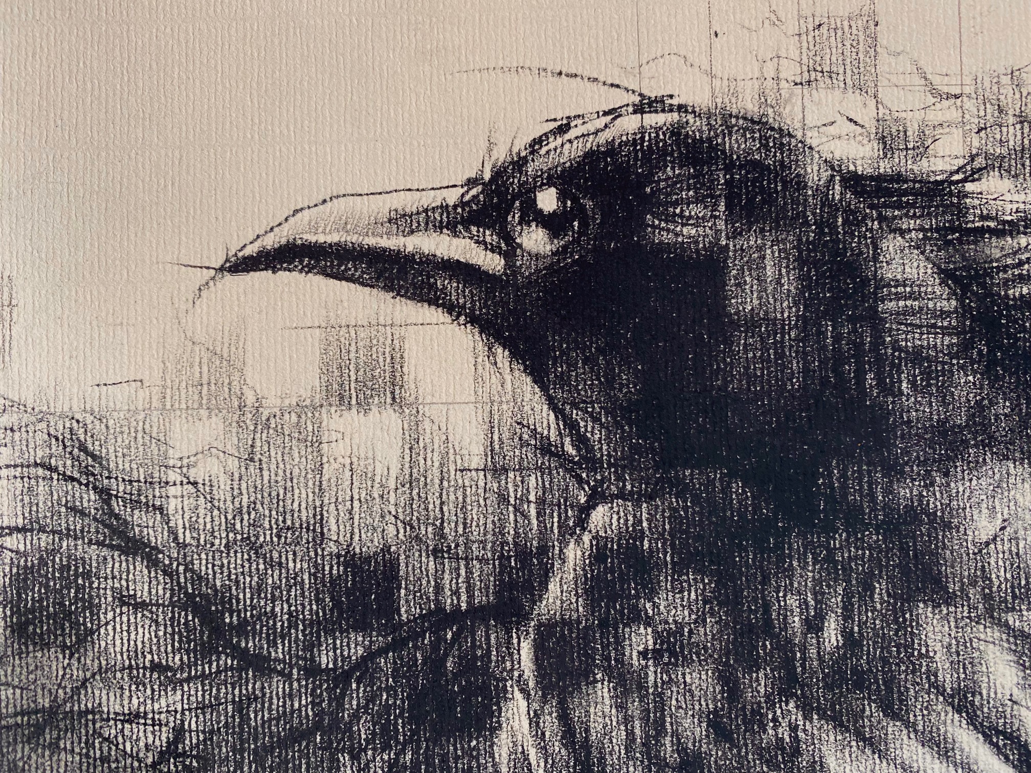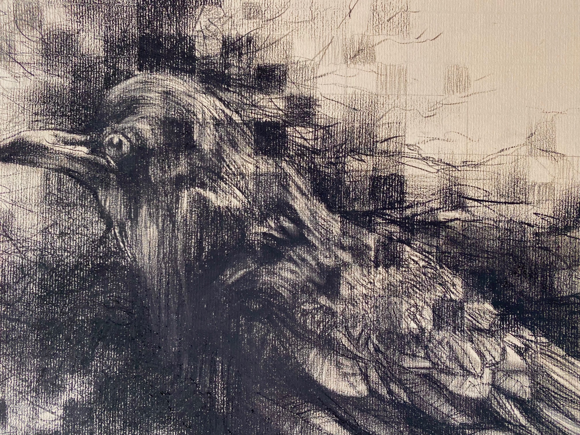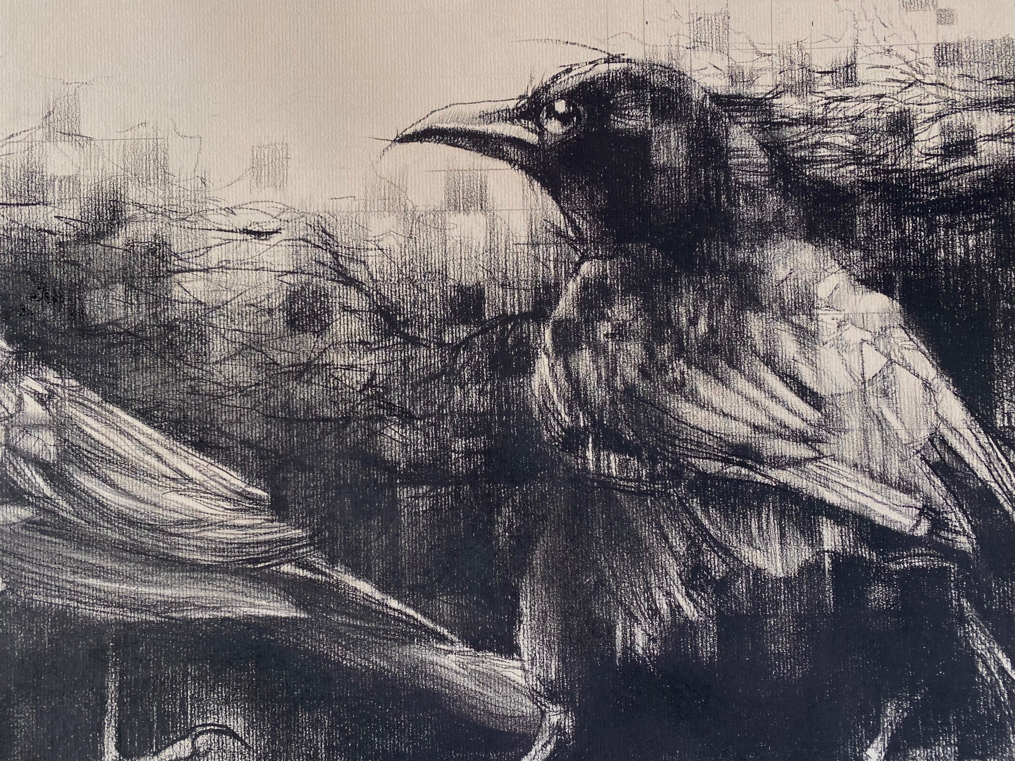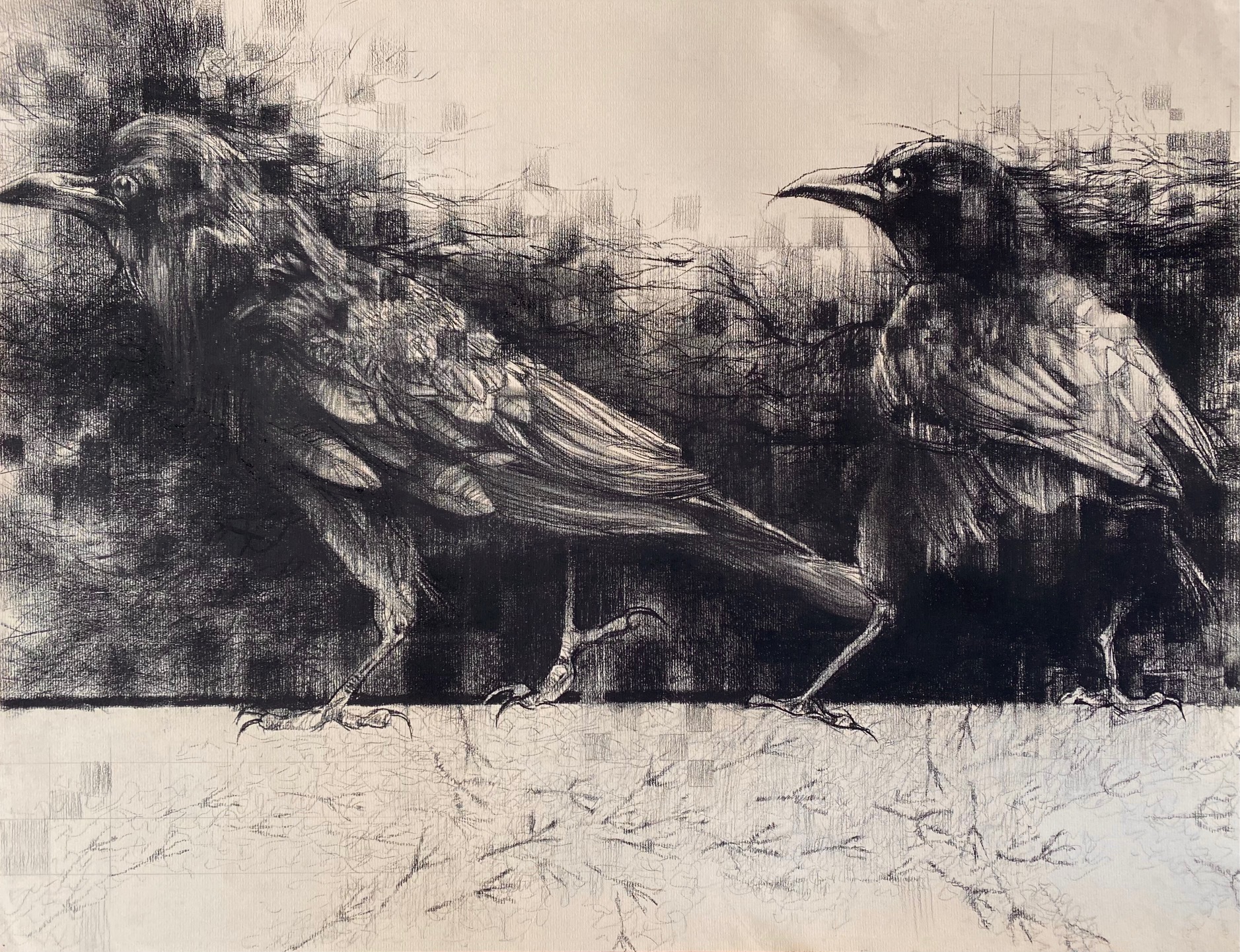 20×26 inches, Charcoal on paper. Two crows on the fence curiously surveying the world.