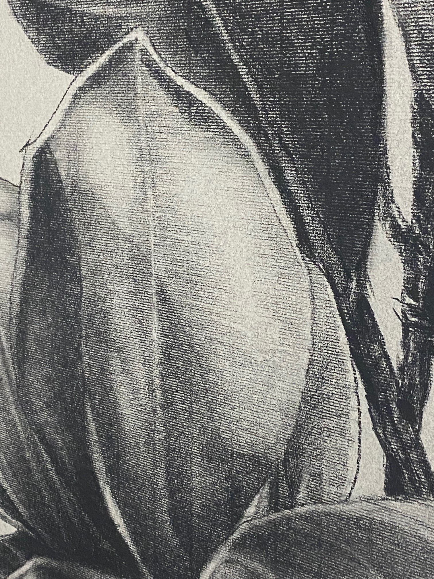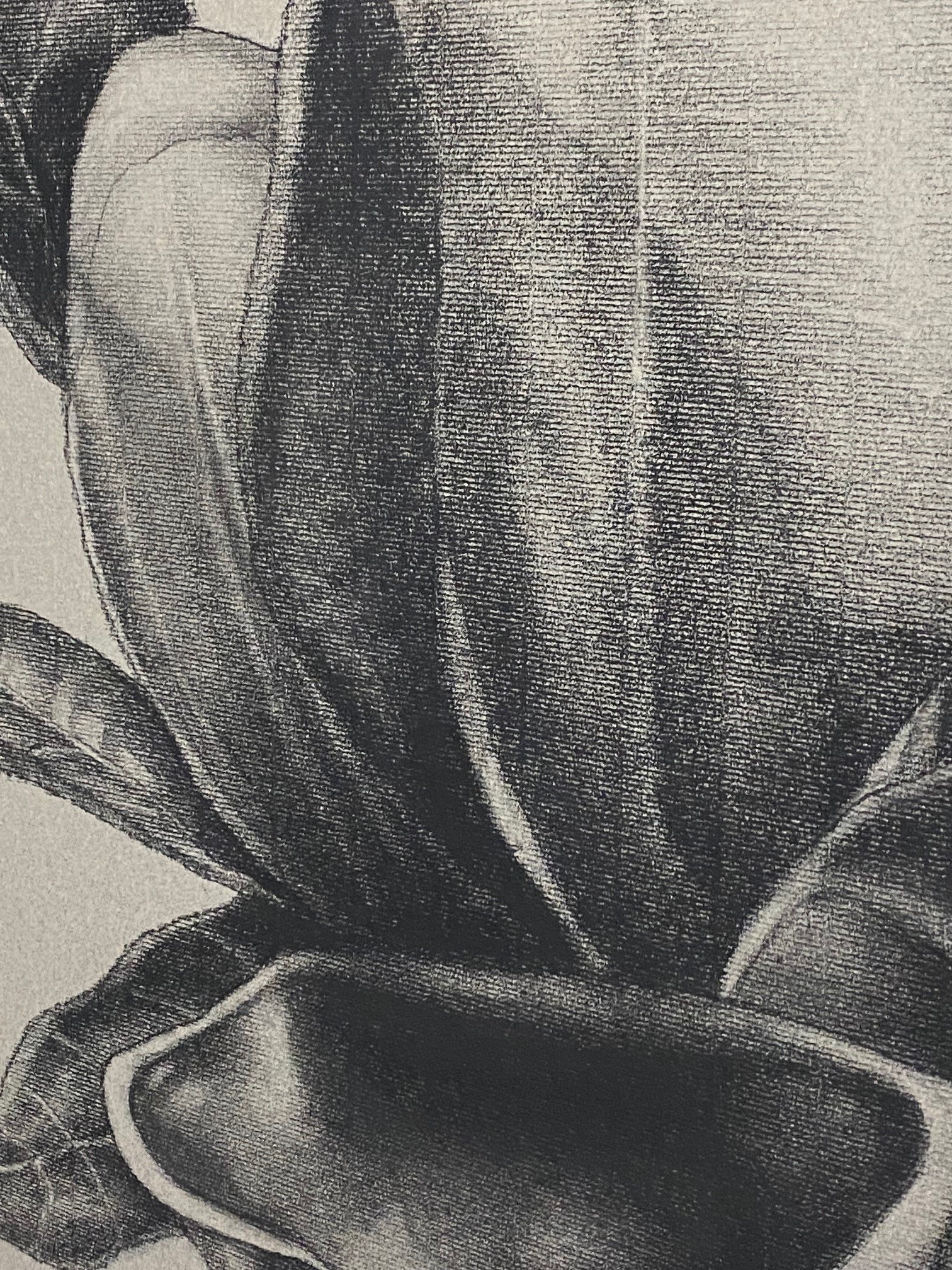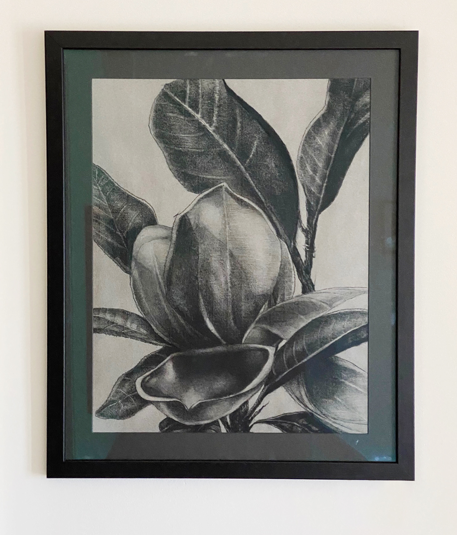 Charcoal on Canson paper. Evergreen magnolia from our garden. Professionally matted and framed.