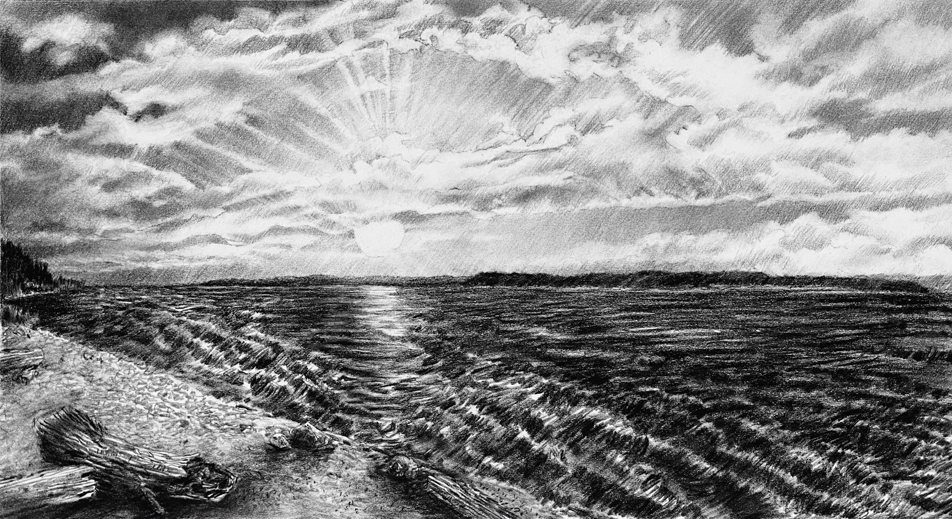 22×12 inches, Charcoal on paper. Seahurst Beach looking back toward Shorewood. Left side half of a diptych