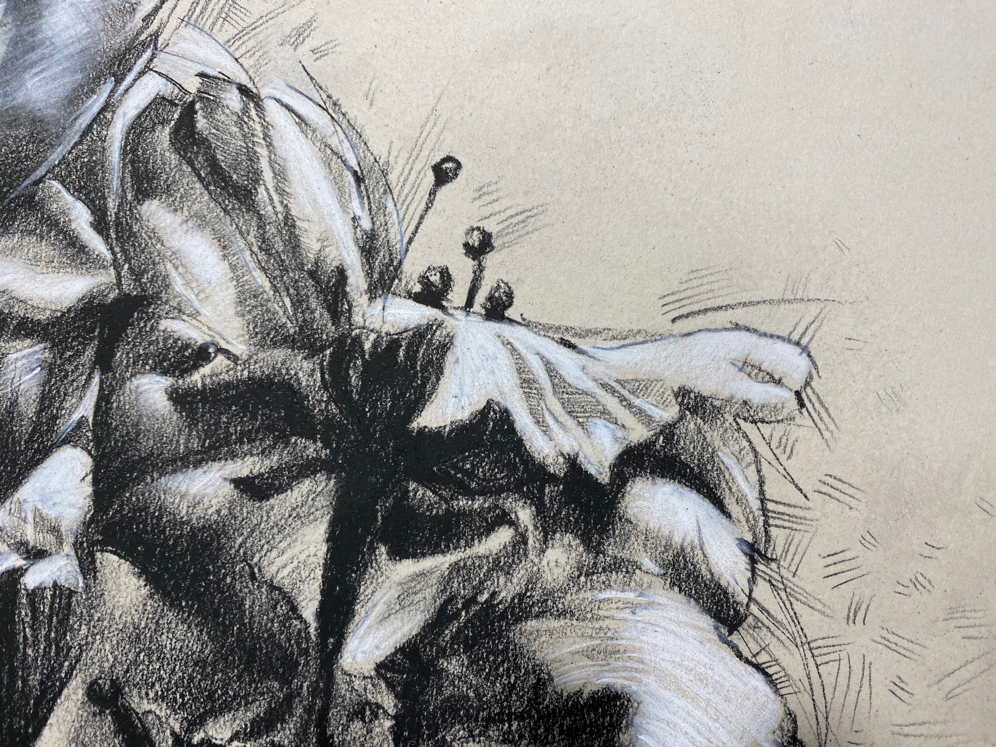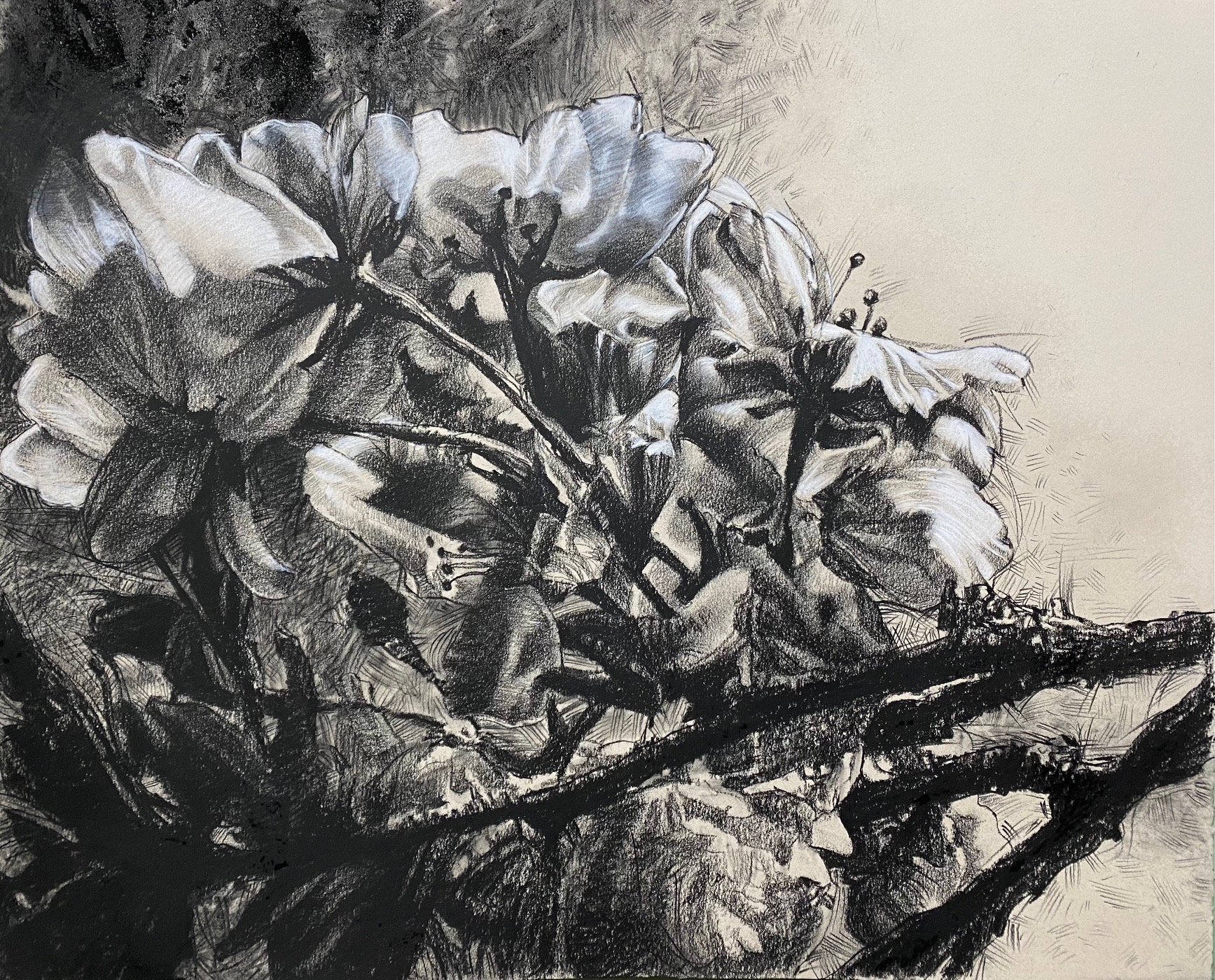 22×19 inches, Charcoal on toned canson paper. Our cherry tree blooming in the springtime. Title is after Japanese haiku.