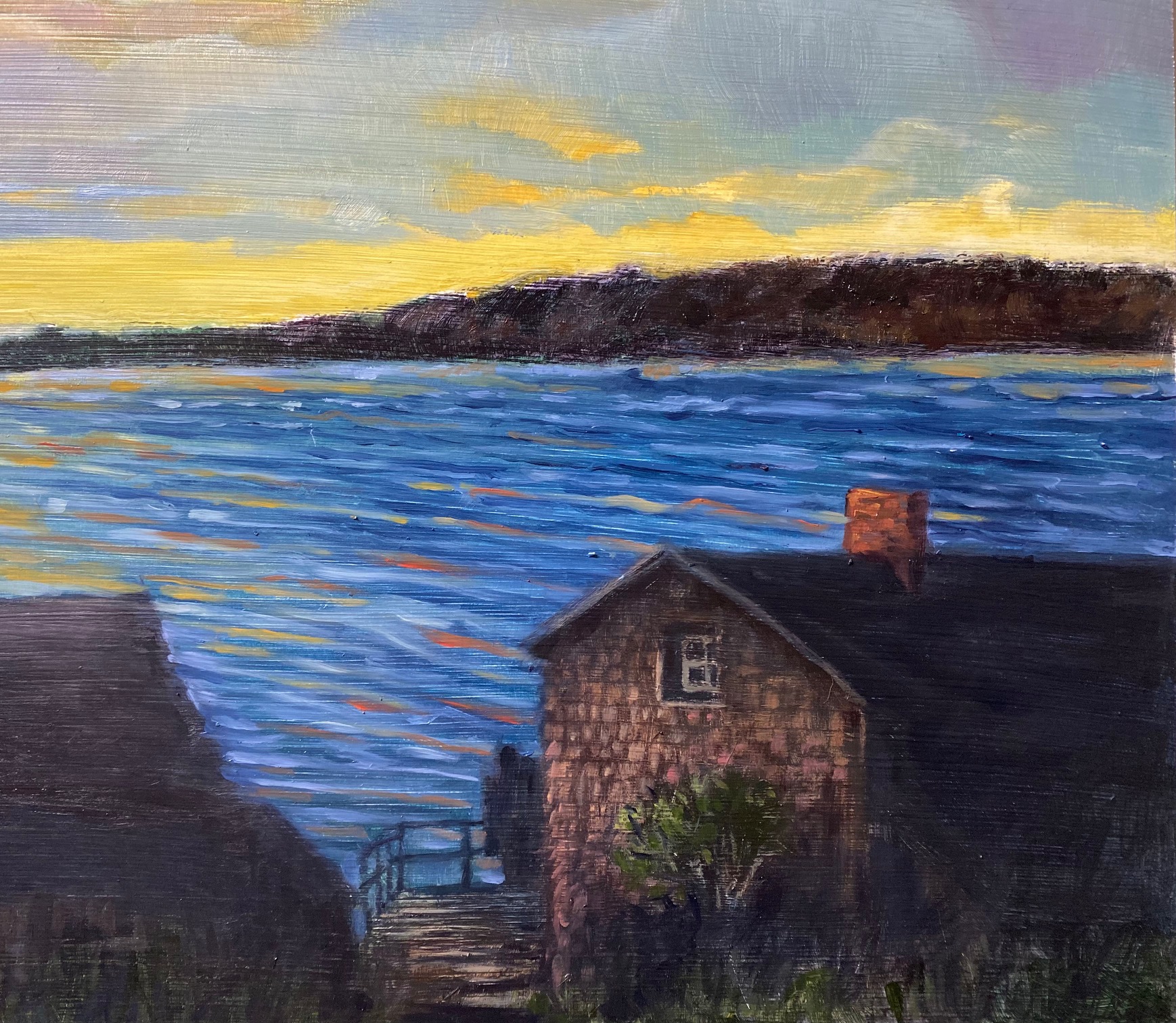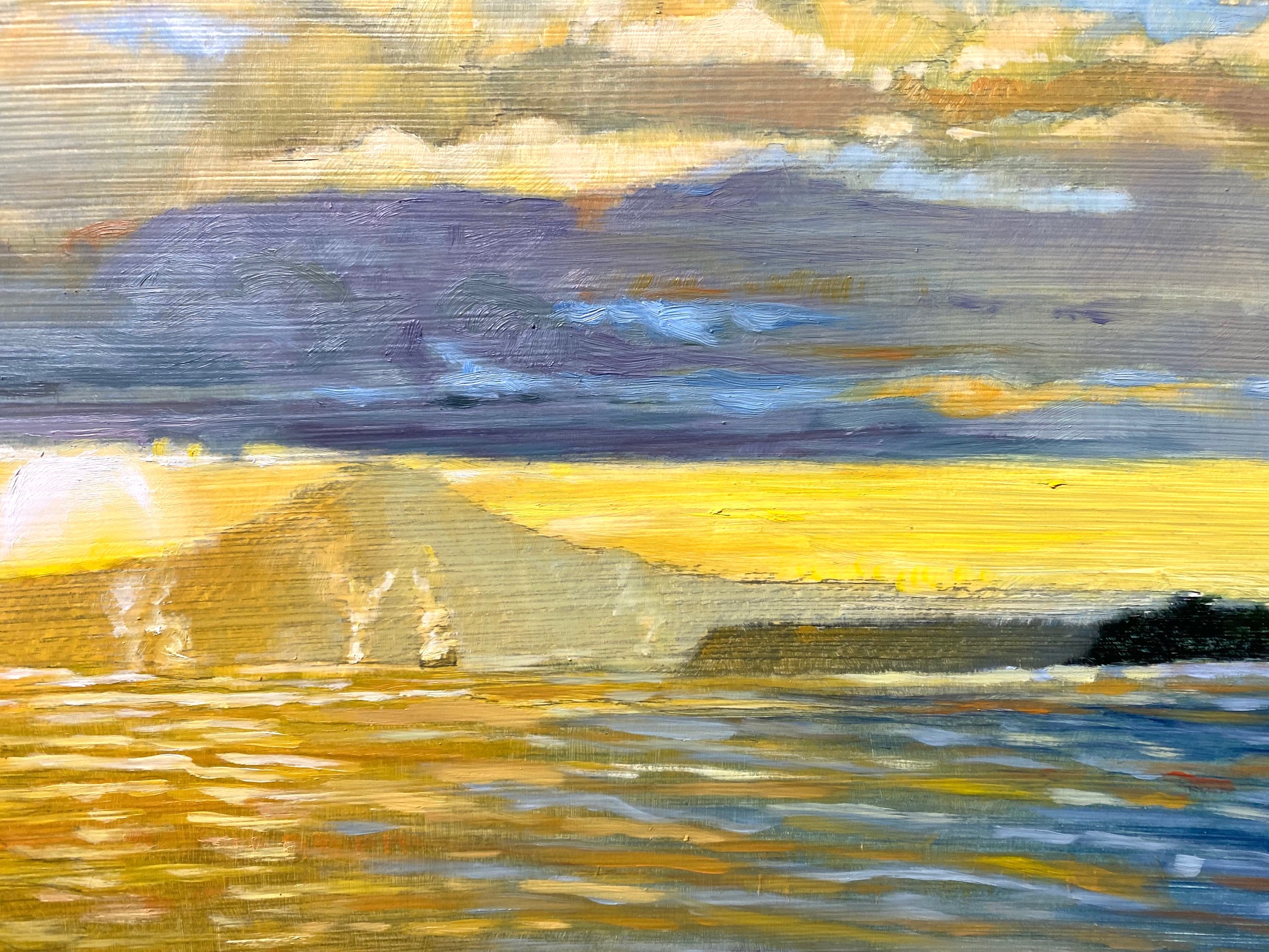 36×18 inches oil on cradled hardboard. Looking back toward Commencement Bay from Sunset Beach near Gig Harbor
