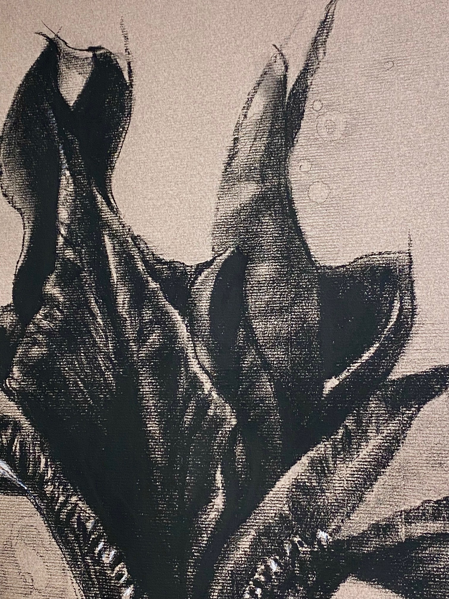 20×25 inches, Charcoal on paper.  Iris from my backyard on Canson paper. Title is after a haiku by Jim Norausky.